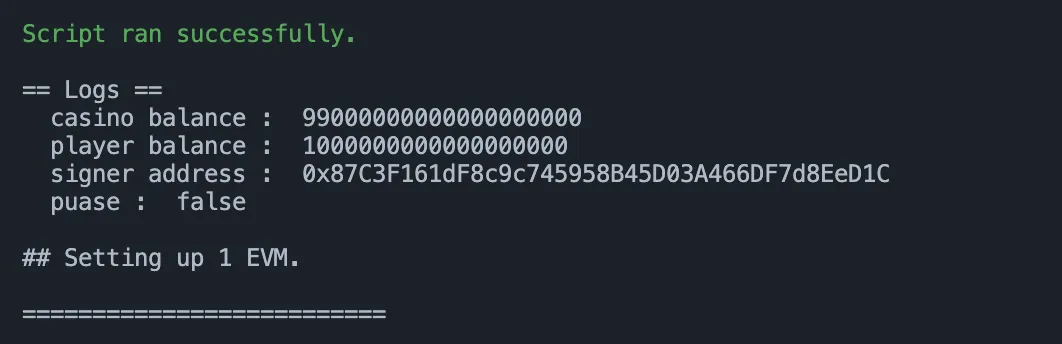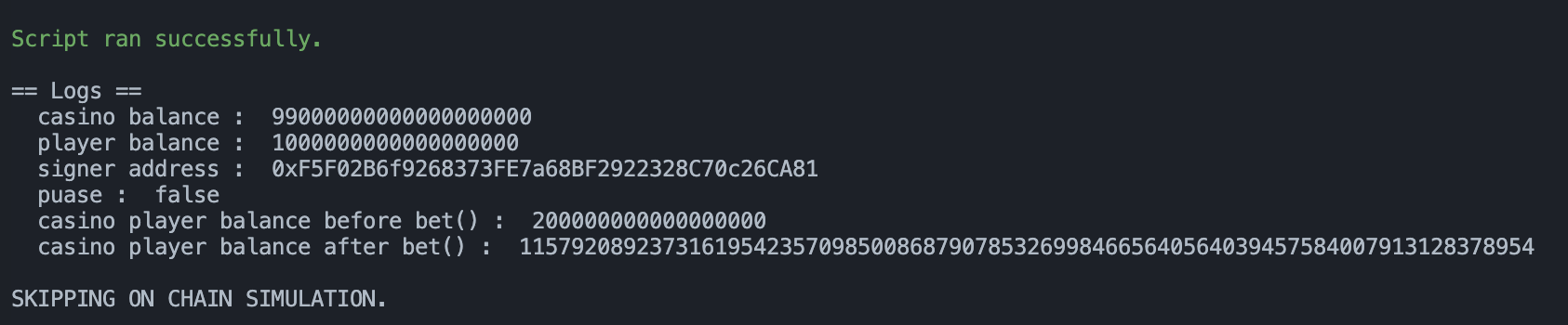 console.log("casino player balance after bet() : ", casino.balances(address(this)));